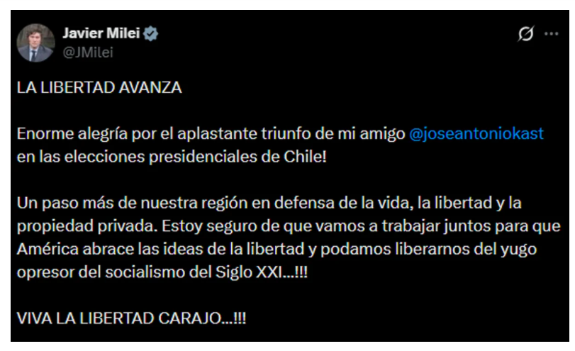 El Presidente celebró el resultado en Chile  y aseguró que es “un paso más” en América Latina, para que se defienda “la vida, la libertad y la propiedad privada”.